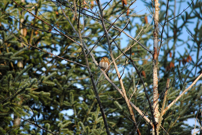 It was a very nice day today so I headed over to a little marsh that is a short walk from my house. There was nothing around when I first got there but after about 15mins of waiting a pissed off group of chickadees announced the arrival of this little owl, he was no bigger than a sparrow. I looked it up on the web and I think he is a Northern Pygmy Owl, I felt very lucky to have gotten some pictures of him.