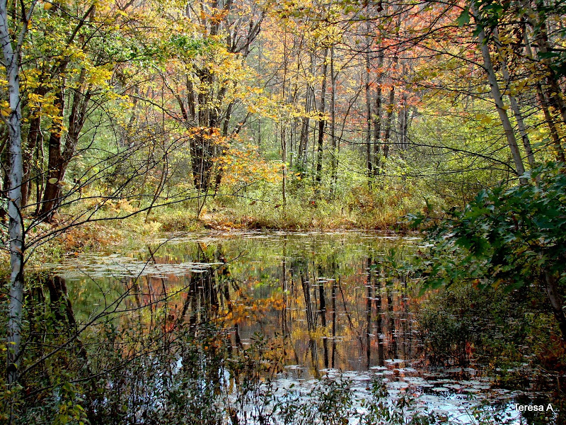 so yesterday, while the turkey is cooking, I take the dogs for their walk. I have my camera, well, because I usually do. Off the trail I see a 5 foot channel of water banked by a big hump of land and then what looks like a pond on the other side. It seems to me that it might make a nice shot because the sun is streaming from the other side. I walk down a little further and the channel narrows to small ditch. So I climb down the bank, hop over and up I go. Now I'm stuck. I look down and my leg is caught in some barbed wire from an old fence line. I disentangle myself and try to remember if I'm up to date on my tetanus. I then make my way back to the spot I had seen by hopping from rock to rock or grass tussock through a swamp. Can I mention that the dogs are gleefully bouncing around threatening to topple me into the swamp at any moment? Finally I get as close as I can. turn on the camera. I have one bar of battery power left