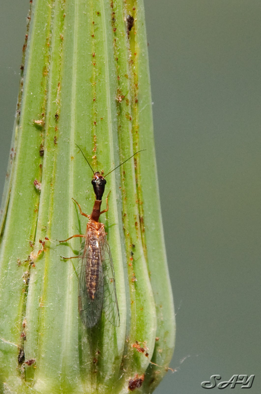 A snake fly, and if I understand correctly, it'll happily eat the yellow milkweed aphids.