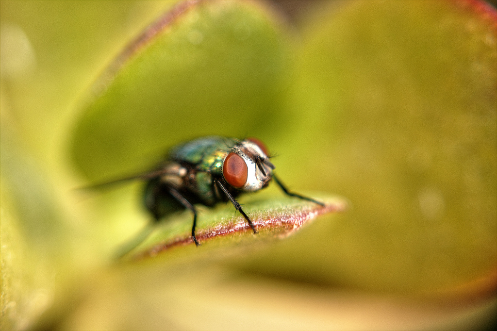 Two very nice images, the detail is fine and you've got focus on the eyes but I feel the composition could be stronger. The placement of the fly in the frame feels awkward to me.