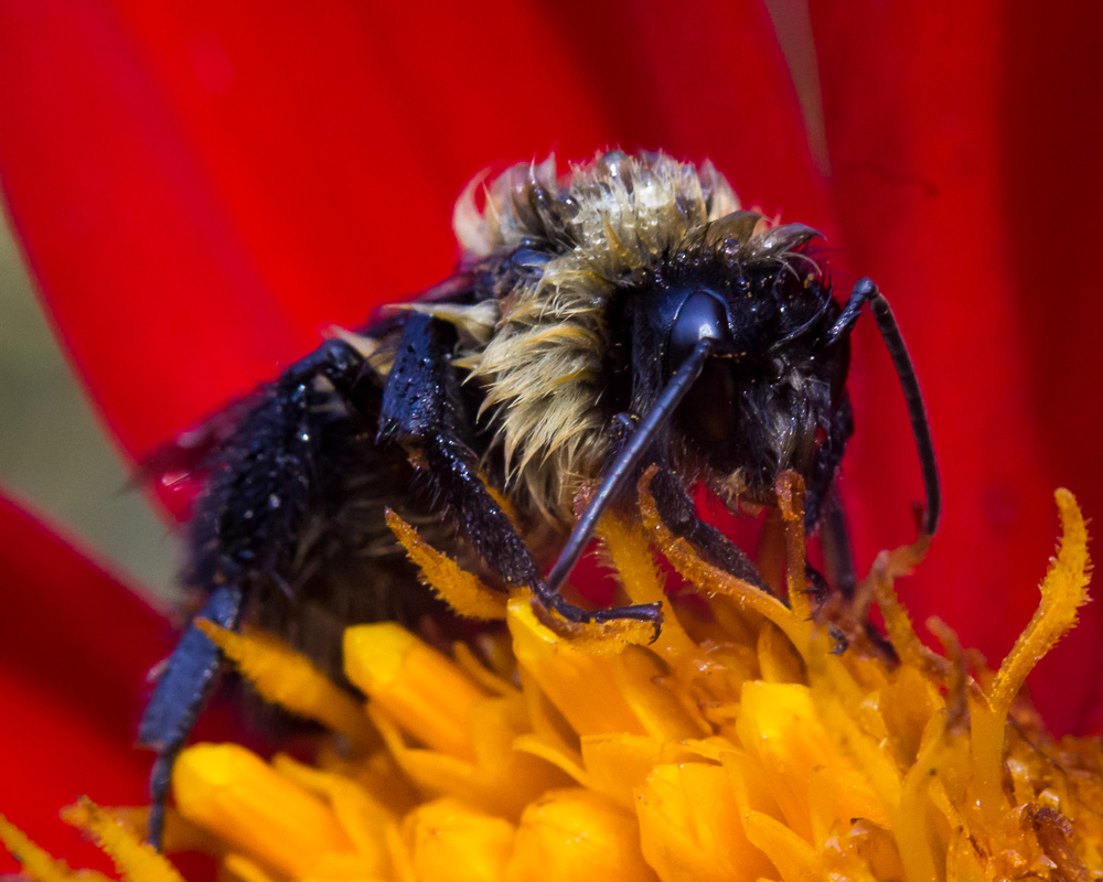 Nothing wrong with this image but my very personal take on this is that I find macros like this 'prettier' with less magnification on the insect. That bee looks scarier here than it actually is.