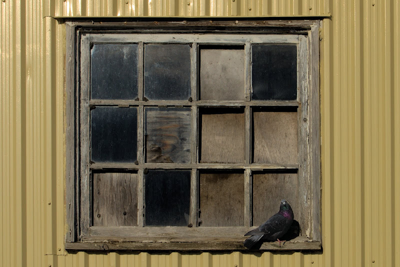 Cool to have a pigeon in your window shot. Interesting combination of an old window with new sheetmetal on that shed!