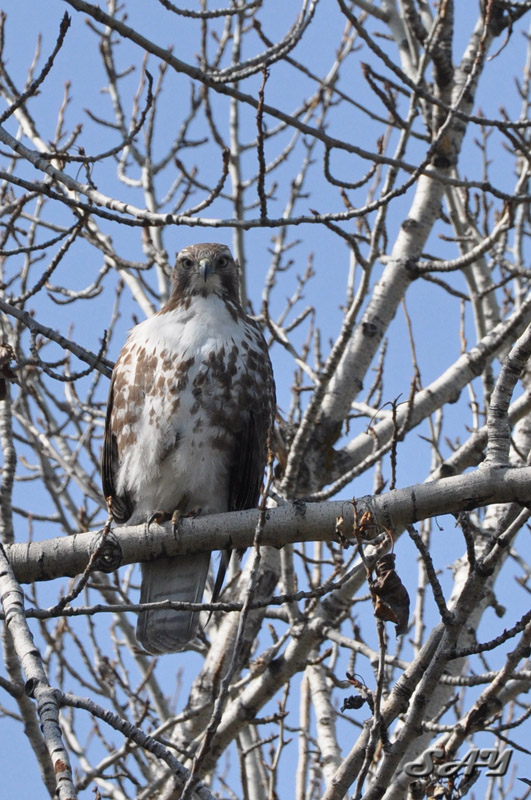 I think it's a juvenile red tail, which might be why he just sat staring at me. He's too young to know better. I wish it was a better shot, but I cropped the heck out of this to get this much, and did evil things with the lighten shadows slider.