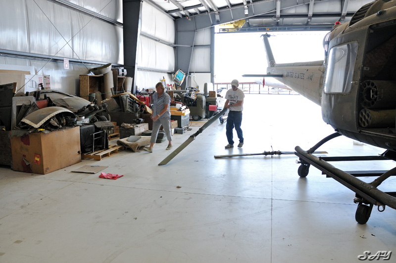 Mike moves the tail rotors so that some of the boxes can be shifted away from the wall as Sue inventories the boxes.