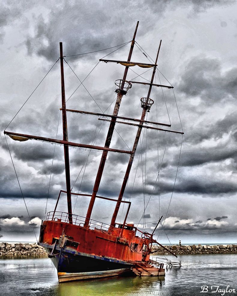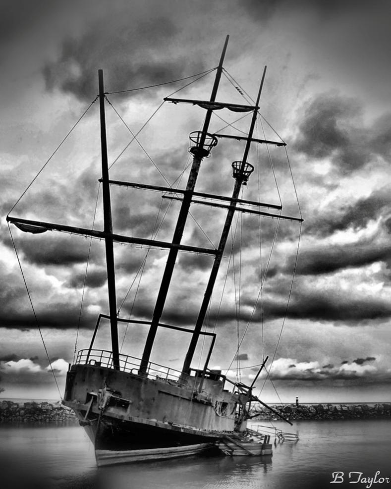 As you are asking for comments and you are OK with critique , I wonder if you are able to draw attention to the hull of the boat and make the sky even more dramatic through some selective dodging and burning. I think that may enhance both versions, but the colour image in particular.