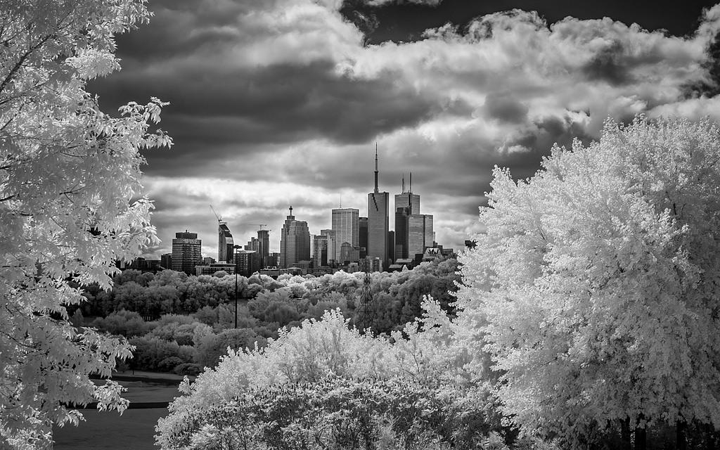 Still a work in progress. Shot on an mostly overcast day. Sun peeking through the clouds in places. View of Downtown Toronto, east of the Don River on Broadview Avenue. Shot this some 4.5 years ago. Just giving run through in Lightroom. Infrared monochrome, Nikon D80.