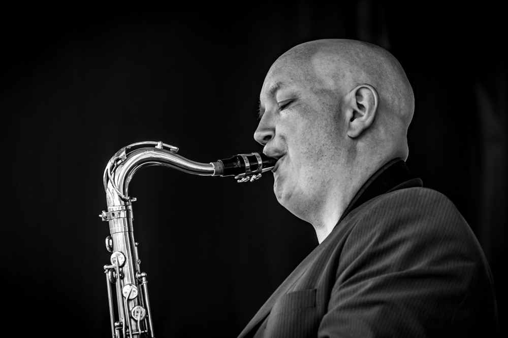 There was large digital screen behind the band. This profile angle was good to keep the screen out the picture. It would change every few seconds. Nice soft display first and then black print on white background an instant latter. Focusing on composition seems simple but was complex. Had to get the right facial expression, right tilt of the head, avoid the screen in the background, and keep the mic and music stand with paper and clothes pegs out of the foreground. Did it in colour first and found it worked better, for me, in monochrome.
