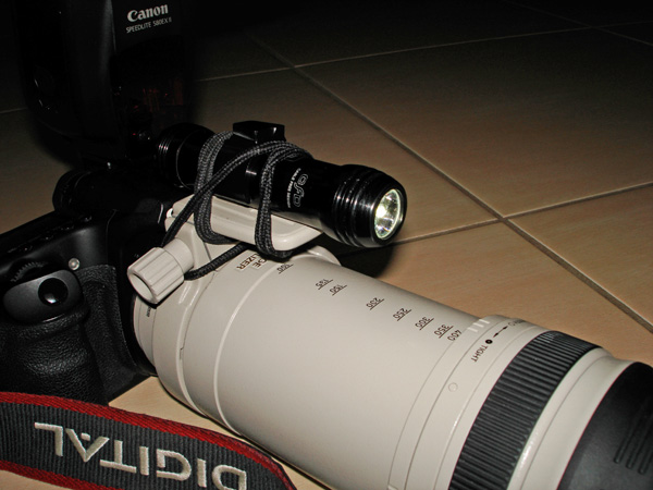 To find the subjects in the first place I use another bike light setup I have. This one is homemade and I've adapted it to take the elastic headband straps on smaller LED headlamps.