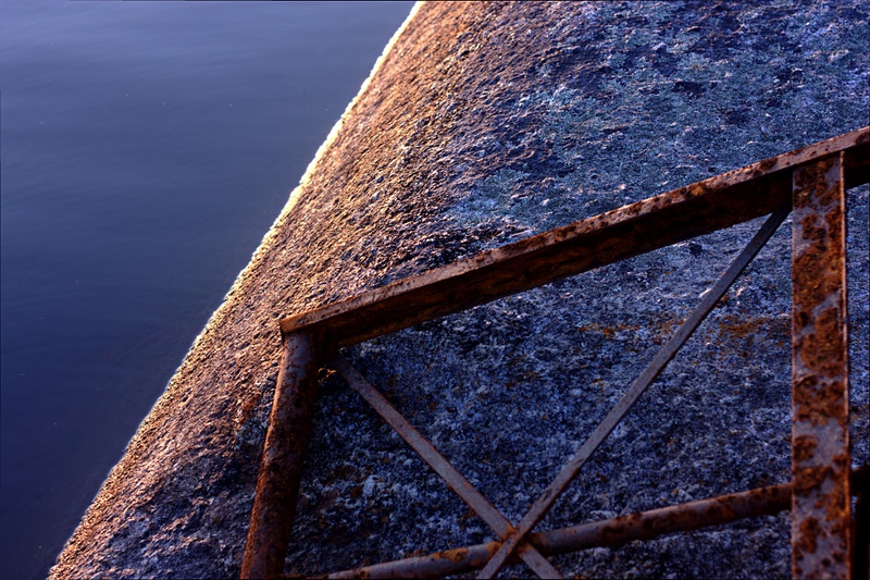 I agree with Bambi about the texture, and I also think the blues of the shadows fading into the tans/browns have potential. My temptation would have been to concentrate on the one corner on the left, with the rust, rock, shadow and fuzzy line into sun. The metal to the right is distracting to me, both because of the size and because it's out of focus. A crop that takes it down to what I mention would probably include a bit of the water line and water. It might also work a bit better in portrait orientation, to take advantage of that larger pipe. On my monitor it's a touch dark - maybe lightening it a bit, so the rust is a bit more visible? Just some ideas to play with.