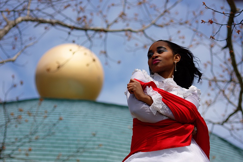 The composition including the selective focus overall is very well done imo, but the gold ball does compete with the model (distracts) instead of compliment the scene.