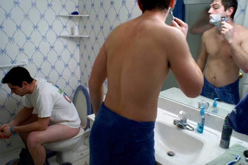 Shot 3- Oh crap (pardon the pun) but here we are in your bathroom again. This is cleverly done and the filter treatment works well I think. A man on a toilet just turns me off though, not that a naked man in front of a mirror does much more for that matter. I reckon having the 2nd person lying on the bed and the 1st standing at a mirror or window might lift this concept further. As far as how you've presented though ... I like.
