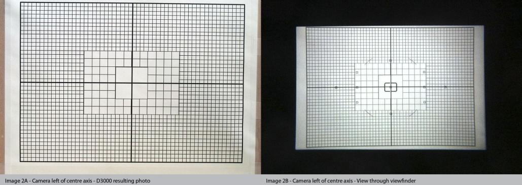 To demonstrate the problem, I have taken some test photos of a grid on a piece of paper. The views through the viewfinder are also shown, and were taken with a separate camera. I hope these photos will help you to see the problem.