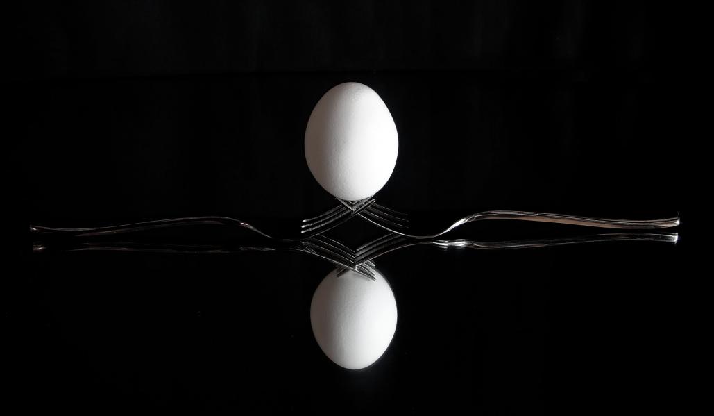 I find this image so compelling. I adore the horizontal and vertical symmetry of it. The lighting and great reflection just add to the photograph's deliciousness. And, it is a bit nerve racking to see the egg balanced that way.