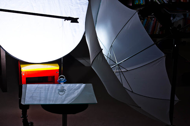 but the reflector hung on the mic stand, and the umbrella's pulled back a bit.