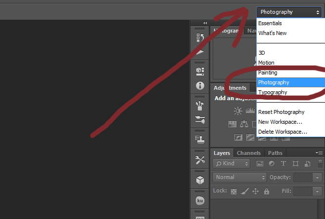 Select "photography" from the drop down box in the top right corner. This will fill the right panel with shortcut buttons to create new adjustment layers.