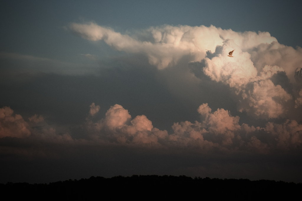 to capture the gathering storm clouds. The gull flying past is really not very sharp, but in my opinion, makes the picture.