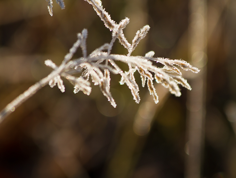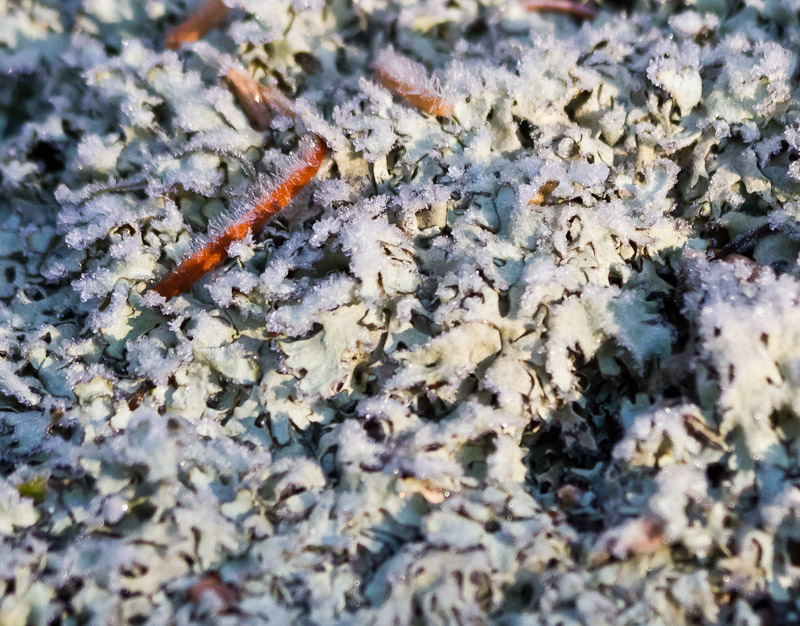 There was a heavy frost last night so the grass along the road was looking pretty good so I snapped a few. The frost covered lichen on the rocks looked neat as well. Missed the DoF by just a little bit though.