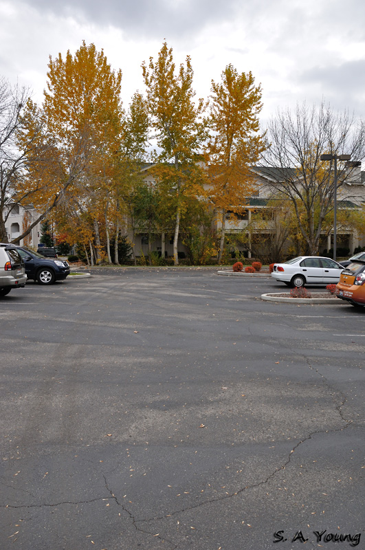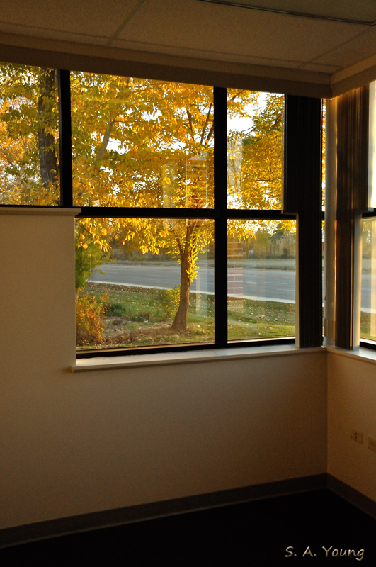 A couple more "see what the lens will do" shots. The field across the street from the office, the parking lot (really exciting!), and an unused section behind my cubical. I get some nice light through those trees in the afternoon.